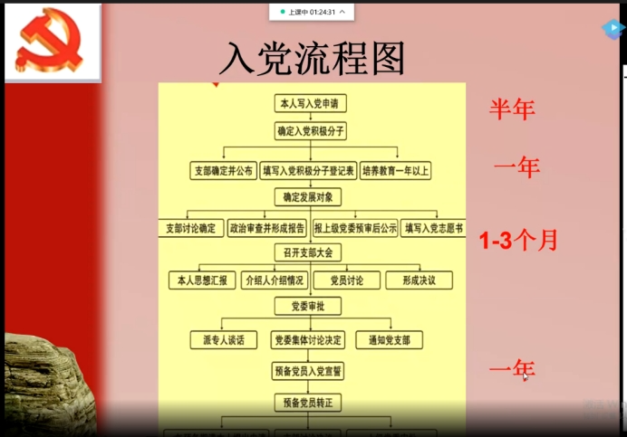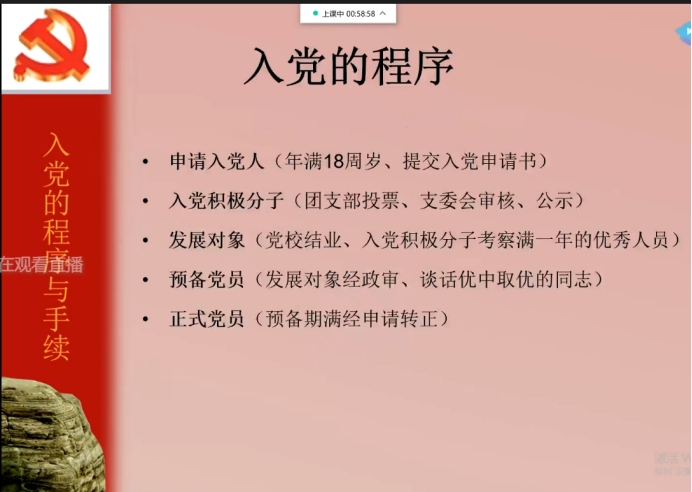 由于疫情影响,学校实行封闭式管理,本次党课课程也相应的改为线上授课。2022年4月2日下午16:40经济管理学院第十二期党校第六课时《入党的程序和手续》于腾讯课堂平台顺利开展。本次课程由机电工程学院党总支委员董艳老师为同学们授课。