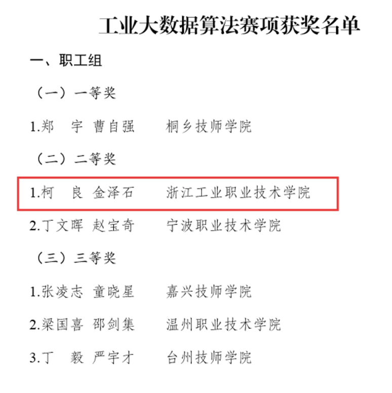 本次大赛聚焦新一代信息技术与制造技术深度融合领域,重点解决企业所需专业技能及新技术应用。经过理论考试和实践操作等环节的激烈角逐,在工业大数据算法赛项中,机电教工第一党支部党员柯良、金泽石老师获职工组第二名(二等奖),机电一体化技术专业史颜乐、李远航同学获学生组二等奖,取得了新突破。同时,柯良老师获本次大赛优秀指导教师。
