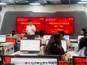 数字财经学院院长王茜、大数据与会计专业教师余茜茜、王丽丽,新道科技浙江分公司总经理程帅、交付服务中心高级教学规划顾问崔明超、校企合作部业务总监陆琴芳等校企双方代表出席,与40余名23级大数据与会计专业的学员共同开启学习之旅。