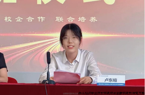 企业代表杭州联合银行卢东暄表示,杭州联合银行扎根杭州70余年,秉持"以奋斗者为本,让平凡人卓越"理念,与浙江经济职业技术学院共建校企双元银行岗位学徒制班,通过"双元驱动"模式(校内专业课程+银行实战教学)培育金融生力军。我行将选派一线精英讲师,讲授银行运营、风险管理等实务课程,助力同学们夯实金融理论基础、锤炼岗位核心技能——服务方向学员需精练点钞、传票录入等基本功,营销方向学员应提升沟通与市场洞察力。期待同学们主动融合理论与实践,在校企共筑的高起点平台上成长为"专业自信、竞争力强"的金融人才,为杭州金融业发展注入新动能!
