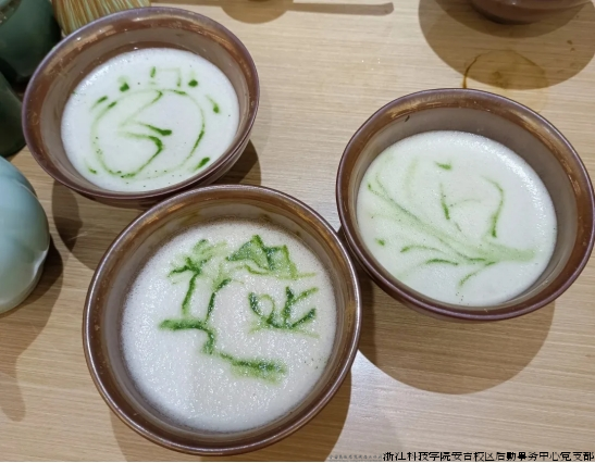 古韵点茶,香透今昔。本期寿师傅生活课堂在后勤老师的带领下,同学们以茶会友,走进宋代点茶袅袅飘香的世界。点茶有七汤,汤瓶注水,纷次而下,淘捣成沫,先而“量茶受量,调如溶胶”,渐成“轻云渐生,浚霭凝雪”,进而“乃可稍纵,茶色尽矣”,终成“乳雾汹涌,溢盏而起”。注水至第七次时,点茶完成,尽显茶汤之美。调膏作画是为后者,茶粉与沸水的相遇。执杆轻触,绿意入目,弯绕之间,梅兰竹菊,浮现茶面。随七汤点茶之法,杯盏之间,悠悠宋韵。艺术悄然联结了千古雅宋,轻嗅,茶香扑鼻,遂制成属于我们的一杯茶。