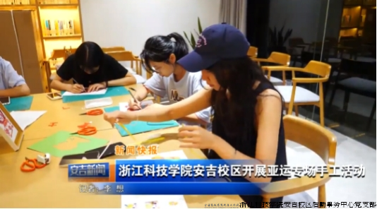 为营造全民迎亚运的热烈氛围,“寿师傅生活课堂”亚运专场手工活动在安吉校区大学生文化社区开展,后勤事务中心指导老师启发学生发挥奇思妙想,通过衍纸、油画、模型等艺术形式创作亚运会相关艺术作品,为亚运助力添彩,安吉广播电视台新闻频道、安吉新闻报等多家电视及纸媒对此进行采访报道。