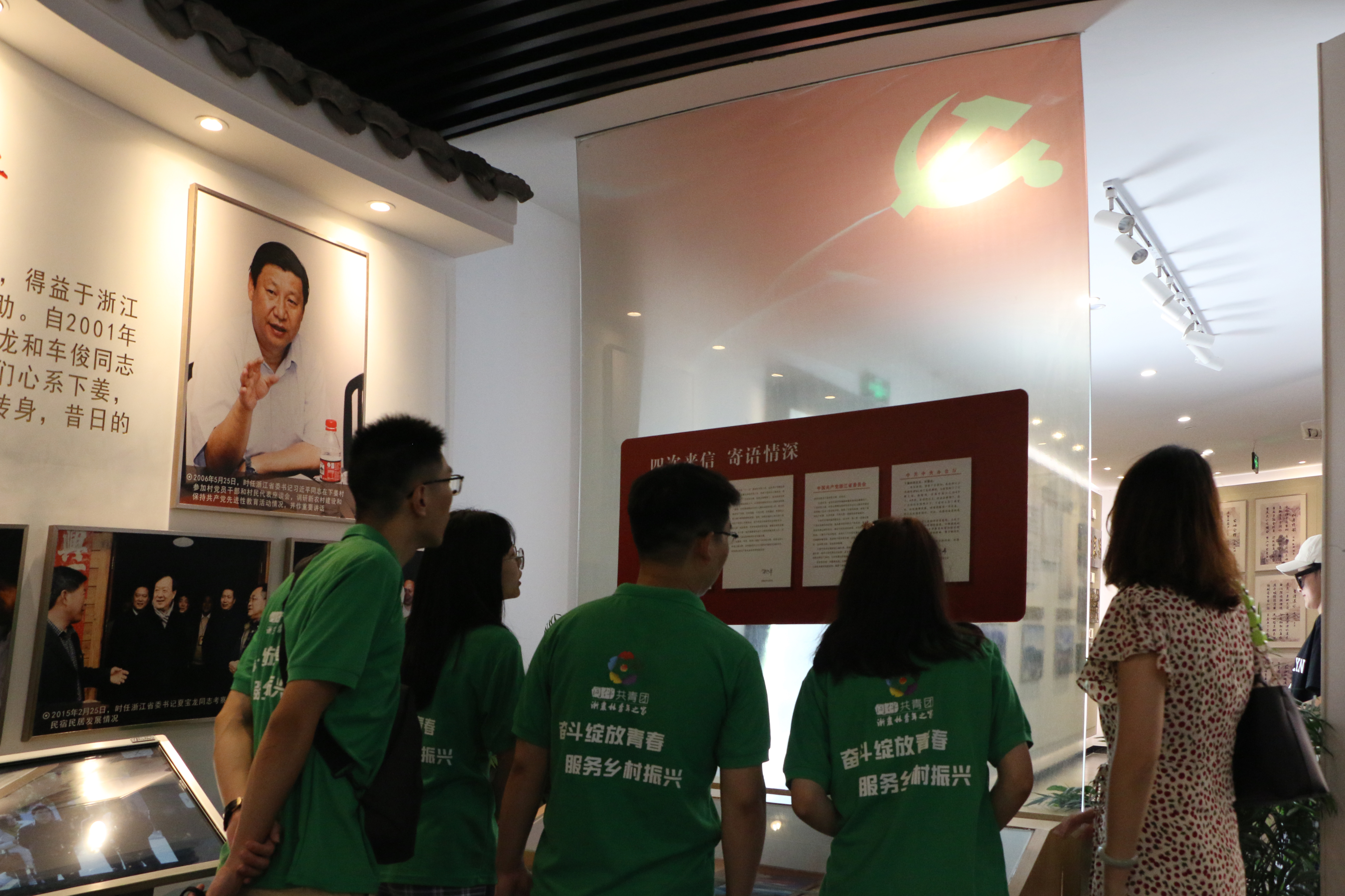 在下姜村,实践团成员们先后参观了“梦开始的地方”文化广场、村陈列馆、文化长廊、思源亭、连心桥、惠民路等下姜村的“地标”。在陈列馆内,大家仔细聆听了介绍,认真观看相关文件、实物和照片,切实感受到了下姜村巨大的发展变化,接受了红色文化的洗礼和熏陶。随后,暑期社会实践团的成员高举右拳,面向党旗庄严宣誓,重温入党誓词,将对党的承诺刻在心尖,付诸于行动。