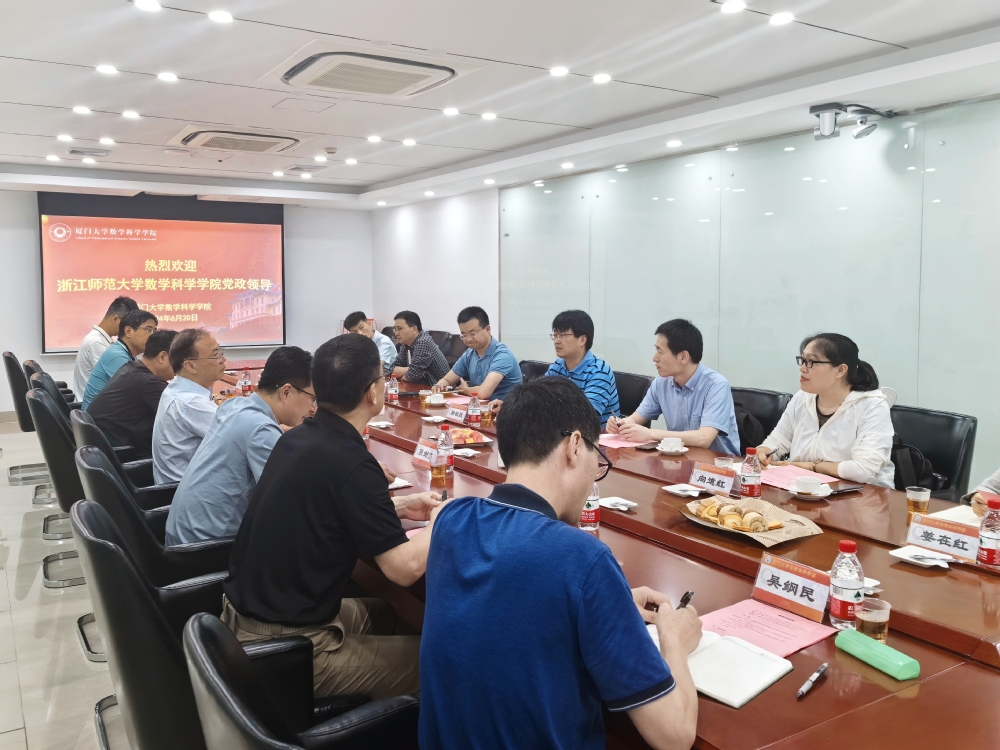 为学习高水平大学数学学科建设经验,加强对外交流合作,助力学科高质量发展,6月20日,院长杨敏波、党委书记张勇等学院领导班子成员一行7人赴厦门大学数学科学学院调研学习。厦门大学数学科学学院党委书记张清榕、院长谭绍滨,党委副书记毛通双,副院长张剑文、金贤安、朱玉峻、宋翀参加座谈会。