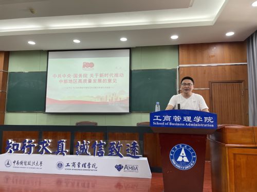 5月5日下午,工商管理学院胡川副院长为2018级本科学生党员讲授《中共中央 国务院关于新时代推动中部地区高质量发展的意见——习近平总书记谋划推动中部地区高质量发展谱写新篇章》专题党课,工商学院本科2018级全体辅导员及学生党员聆听课程,党课由2018级第一党支部书记水晶晶老师主持。