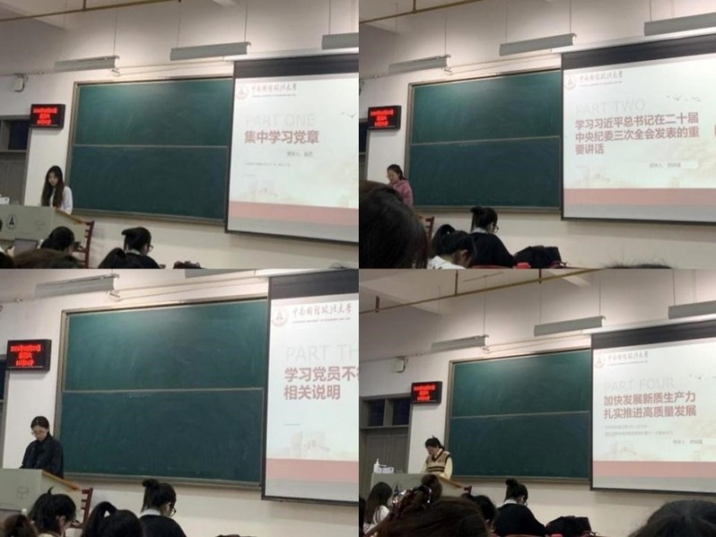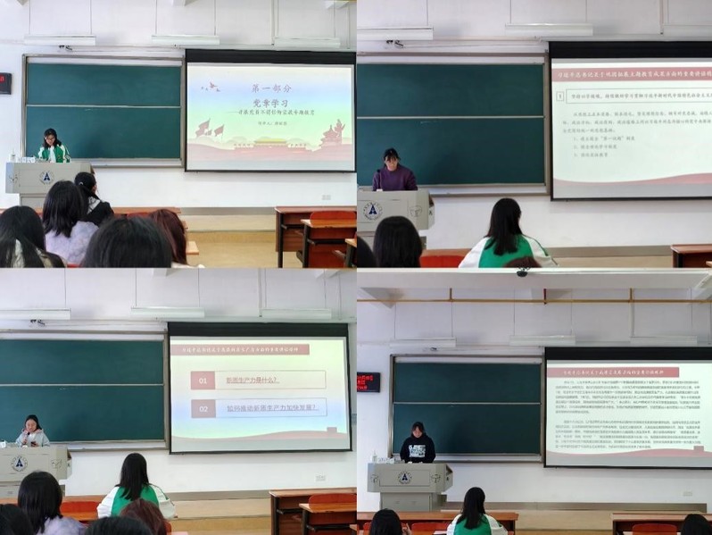 3月28日,党支部第二批入党积极分子在南附楼教室召开“巩固拓展主题教育成果,凝心聚力推动高质量发展”主题党日活动。活动伊始,徐丽蓉同学带领全体成员集中学习《中国共产党章程》,详细介绍了党章党规对于宗教信仰的规定,以及新修订的《中国共产党纪律处分条例》。接着,姚珂同学领学习近平总书记关于巩固拓展主题教育成果方面的重要讲话精神,要求支部成员坚持以学铸魂、以学增智、以学正风、以学促干。领学人明雪嫣从新质生产力是什么、如何推动新质生产力加快发展两方面详细介绍两会关键词“新质生产力”,强调高质量发展需要新的生产力理论来指导。最后,赵训弋领学习近平总书记关于高质量发展方面的重要讲话精神,指出推动高质量发展是我国经济发展的鲜明主题,是我党准确把握经济发展阶段特征和发展趋势,基于新需要、新问题、新要求作出的重大战略决策。