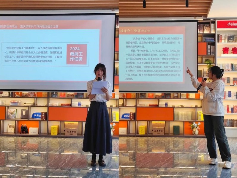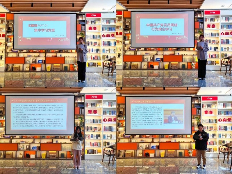 3月29日,工商管理学院本科2022级党员同学们在倍阅书店开展3月主题党日活动。集中学习党章后,领学人肖云雅带领支部成员学习中国共产党党员网络行为规定,强调网络安全事关国家安全,党员在认识到网络重要性的同时,要严格规范网络行为,树立网络安全防范意识。聂星洋同学领学习近平总书记有关讲话精神,表明了我党在未来深入推进党的自我革命、坚决打赢反腐败斗争攻坚战持久战的决心,突出“学思想、强党性、重实践、建新功”的总要求。随后,领学人赵家斌带领支部成员集中学习全国“两会”精神,详细解读了第十四届全国人民代表大会第二次会议政府工作报告。