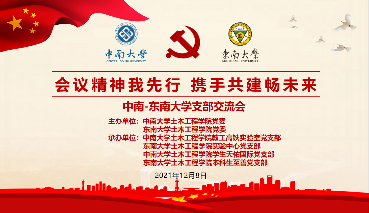 为深入学习贯彻党的十九届六中全会精神,加强高校间支部交流与合作,提升基层党组织组织力,12月8日下午,由中南大学土木工程学院党委、东南大学土木工程学院党委主办,中南大学土木工程学院教工高铁实验室党支部、学生天佑国际党支部、东南大学土木工程学院实验中心党支部、本科生至善党支部联合承办的“全会精神我先行,携手共建畅未来” 党支部云共建活动以线上-线下相结合的方式举行,分会场分别设于中南大学铁道校区立志厅与东南大学九龙湖校区土木楼222会议室。活动由杨舒焜同志与平鹏昕同志主持。