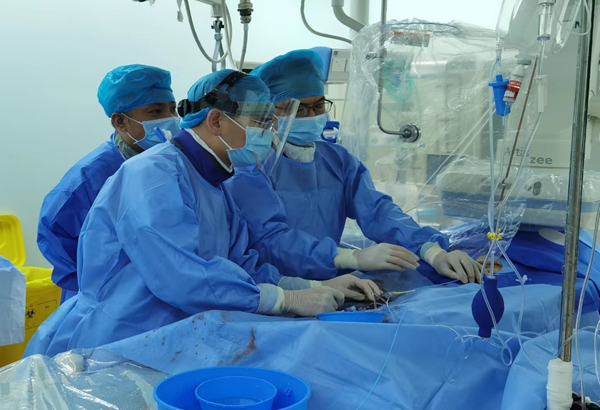 国庆节当天,在心血管内科李江教授、叶慧俊副教授、唐亮副教授带领下,心脏介入中心医护技团队为一位高危、高龄住院重症患者完成了急性肺梗手术血栓抽吸以及球囊扩张术,术后患者肺功能改善明显。手术刚结束,团队又立即投入到另一例急性心梗手术抢救中,经冠状动脉造影(CAG)检查发现,患者前降支闭塞合并左主干狭窄,经与患者家属充分沟通后,团队快速、安全开通闭塞血管后,在血管内超声(IVUS)指导下精准进行了球囊扩张及支架植入,安全平稳结束手术。10月2日晚10点心导管室副主任唐亮接到总住院电话,胸痛门诊接诊一位急性广泛前壁心梗患者,且无家属陪同,唐亮副教授查看患者心电图及相关检查后考虑到时间就是生命,越早打开阻塞的血管存活的心肌就越多,当即便启动心梗绿色通道。为了抓紧每分每秒,从患者就诊再到血管开通,唐亮副教授与团队高效配合,从患者进入急诊科到手术完成(D to B时间)仅用时54分钟!术后病人安全返回病房。截止目前,10月1日完成急性心梗手术两台,10月2日完成急性心梗手术一台。
