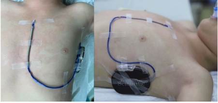 9岁的患儿南南(化名)因“意识丧失1次,心肺复苏术后1月”入院。刘启明教授带领心脏电生理团队,根据心电图长QT间期表现、注意力缺陷及多动障碍、并指等临床特点和CACN1C基因杂合变异,综合分析考虑诊断为国际罕见的Timothy综合征。12岁的患儿武武(化名)因“晕厥2次”入院,考虑为恶性心律失常幸存者,两人均有心脏性猝死二级预防指征。术前,刘启明教授带领团队与心血管外科、儿科、麻醉科等多学科深入讨论交流,确定了手术的必要性和可行。为了保证手术安全和顺利进行,心血管外科廖晓波教授、龚医博副教授术中给予了紧密配合。手术在全麻下进行,采用两切口植入(左腋中线第5-6肋切开约5cm切口,剑突左上缘1cm处切开长2cm切口),全皮下操作,无需穿深静脉,整个手术过程顺利。