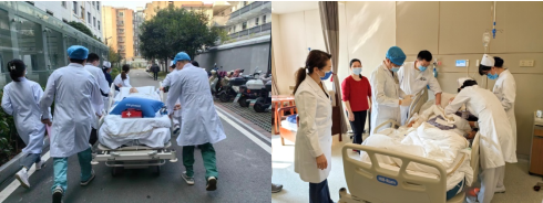 听闻消息后,王海琴主任立即组织在场的医护人员启动紧急救援程序,建立静脉通道、做动脉血气分析、心电图,予以中心管道吸氧,床旁心电监护,备抢救车,同时请心内科刘启明教授急会诊。刘启明教授凭借其专业的知识和丰富的临床经验,结合患者病情,即可送往心导管室,安装起搏器。确定方案后,护士长立刻组织了一支由四名医生和六名护士组成的急救队伍进行转运。转运途中,患者突发心跳骤停,在场的心导管室阳辉医生和护士长崔薇、护士刘艳立即对患者实施胸外心脏按压,十秒钟后患者恢复自主心跳和意识。