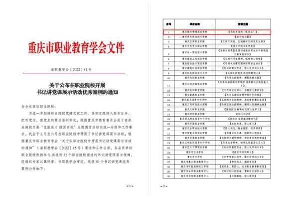 据悉,本次活动旨在进一步加强重庆市职业院校党建思政工作,落实立德树人根本任务,把听党话、跟党走的要求落在实处。此次活动全市各会员单位积极参加,经专家评审、重庆市职业教育学会审定,最终公布50个“书记讲党课”优秀案例。