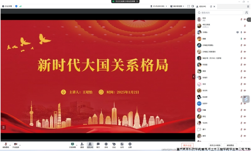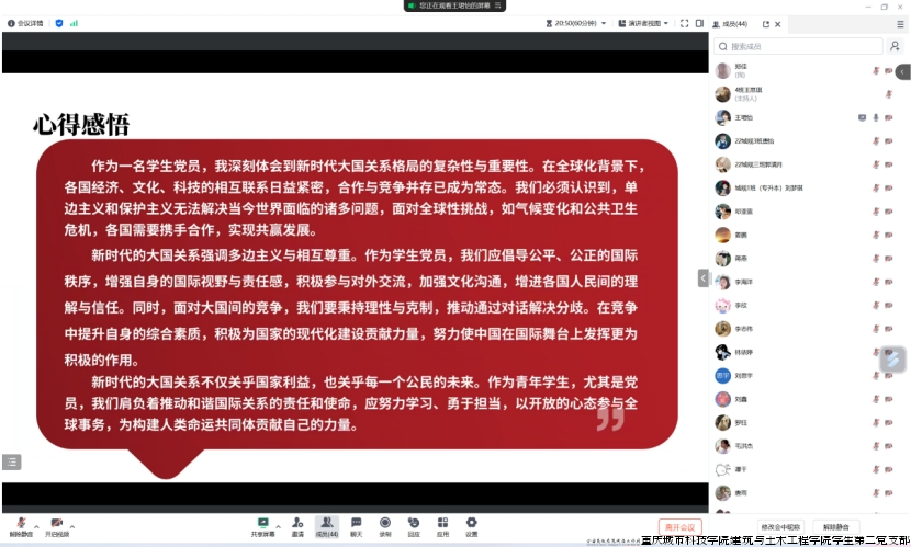 会议伊始,王珺怡同志分享了国际政治背景,深刻剖析了当前国际形势的特点与挑战,并提出了中国在全球治理中的责任与担当。她指出:“面对百年未有之大变局,各国唯有携手合作,才能有效应对诸如气候变化、经济复苏、公共卫生等全球性挑战。中国将继续秉持人类命运共同体理念,加强与其他国家特别是发展中大国的交流合作,共创和平稳定、繁荣共享的美好未来。”新时代的大国关系不仅关乎国家利益,也关乎每一个公民的未来。作为青年学生,尤其是党员,我们肩负着推动和谐国际关系的责任和使命,应努力学习、勇于担当,以开放的心态参与全球事务,为构建人类命运共同体贡献自己的力量。