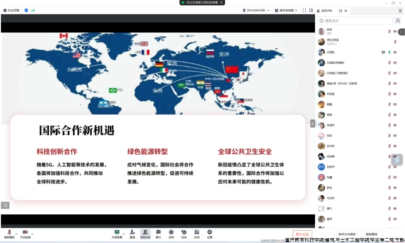 会议最后,王彦杰同志作出总结。他表示在当今的世界当中,各国相互依存,相互竞争。中国坚定地走和平与发展的道路,积极地推动人类命运共同体,展现着中国的大国担当。他强调希望各位党员同志能够认识到作为一名党员要时刻关注国际形势,理解国家在国际舞台上的战略选择。在日常的工作当中,应要秉持着开放合作的理念,提升自己的素质,为支部、为学校、为国家做出自己的一份贡献,做到学生党员的先锋模范作用。