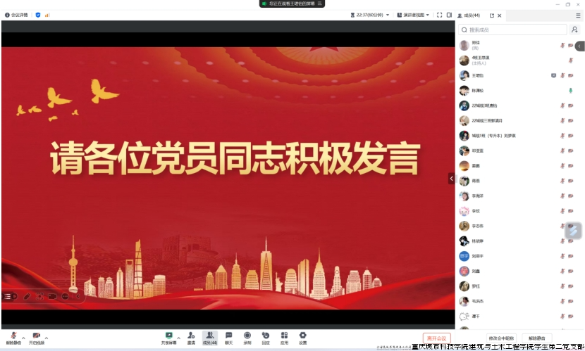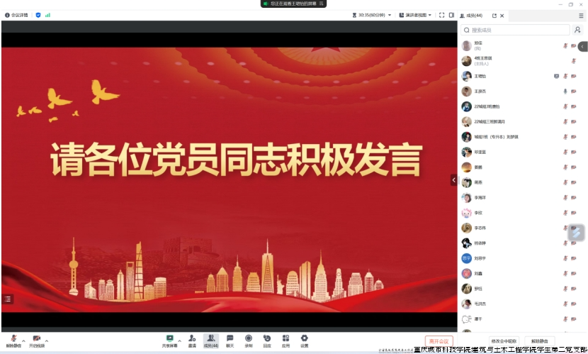 为巩固拓展学习贯彻习近平新时代中国特色社会主义思想主题教育成果,进一步强化支部成员党性修养。建筑与土木工程学院学生第二党支部于1月2日12:25在线上开展组织生活,支部全体党员参加本次会议。会议由王珺怡同志主持。