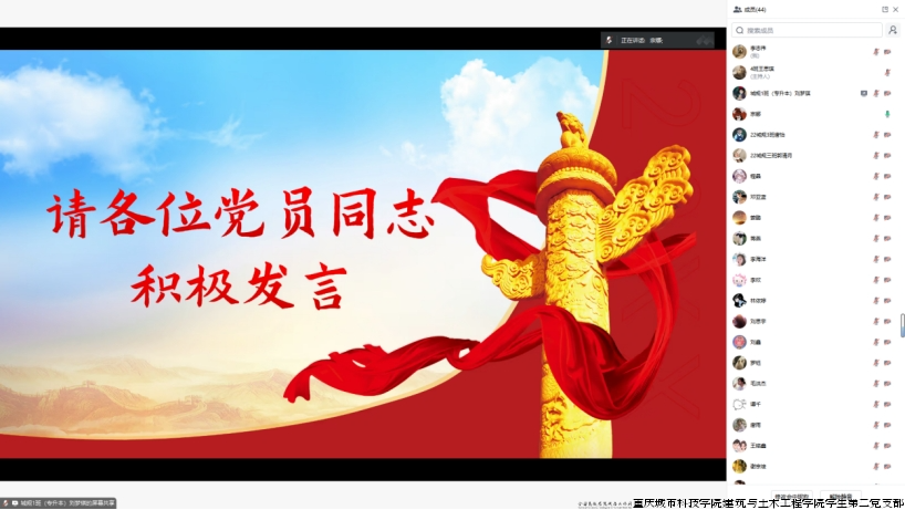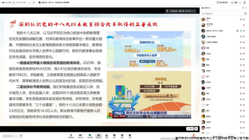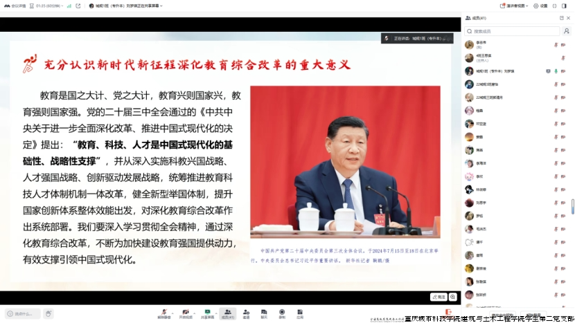 为深入学习党的二十届三中全会精神,贯彻党的教育方针,强化使命担当,提升专业素养,助力教育综合改革迈向新征程,建筑与土木工程学院学生第二党支部于2025年1月9日12:25在线上开展以“深化教育综合改革”为主题的组织生活。会议由刘梦琪同志主持,支部全体党员参加本次会议。