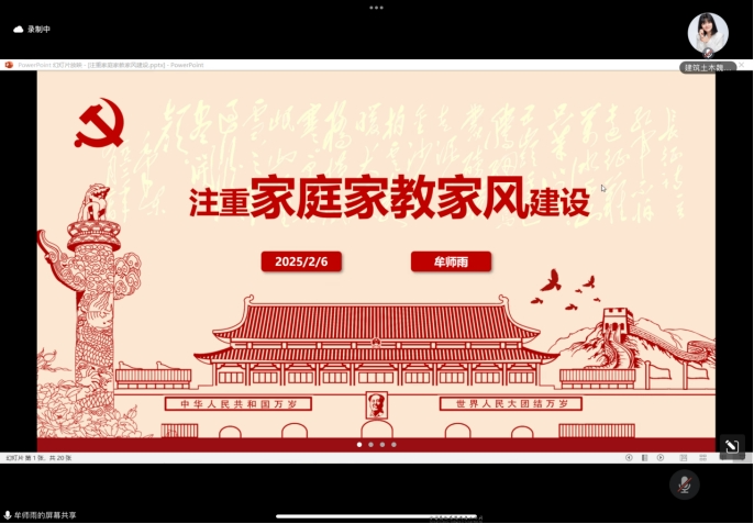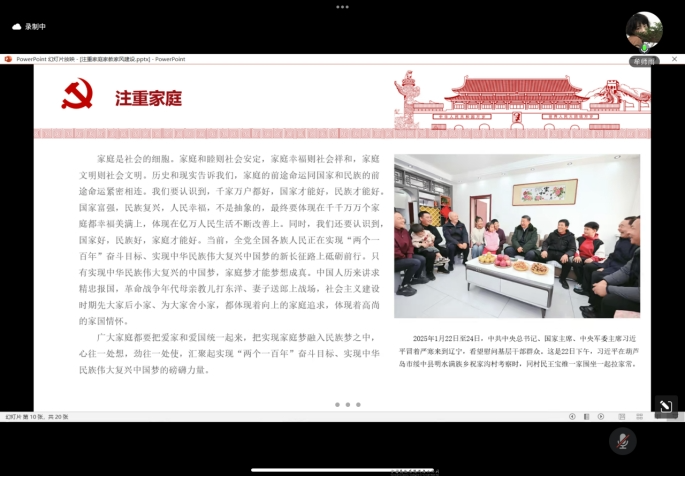 为推动形成爱国爱家、相亲相爱、向上向善、共建共享的社会主义家庭文明新风尚,建筑与土木工程学院学生第二党支部于2025年2月6日12:25在线上开展以“注重家庭家教家风建设”为主题的组织生活。会议由牟师雨同志主持,支部全体党员同志参加会议。