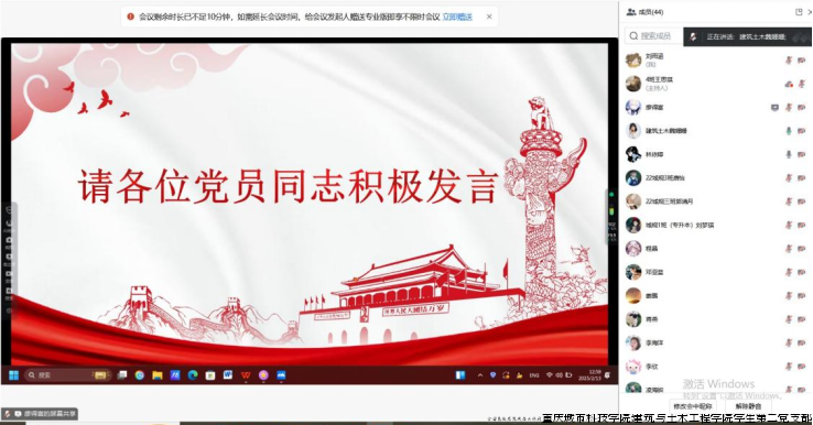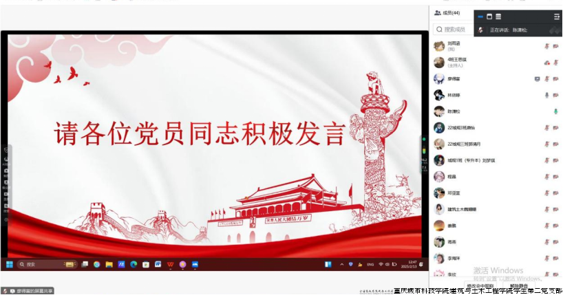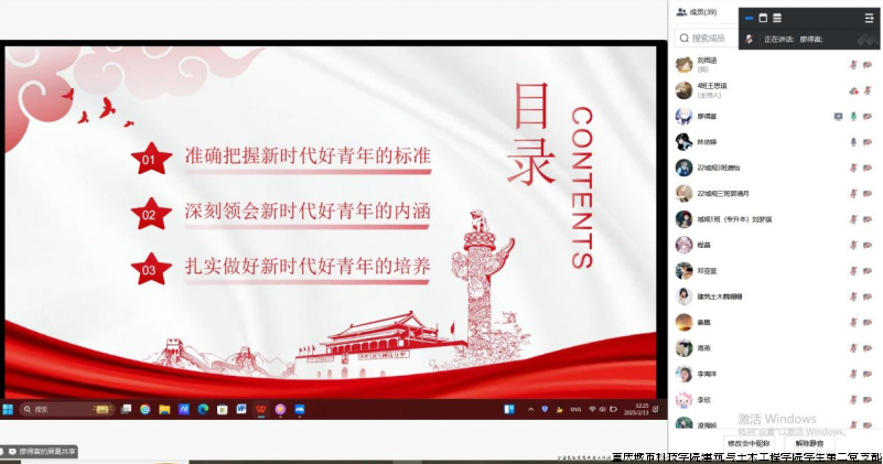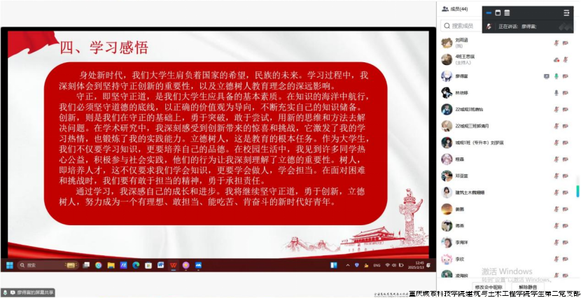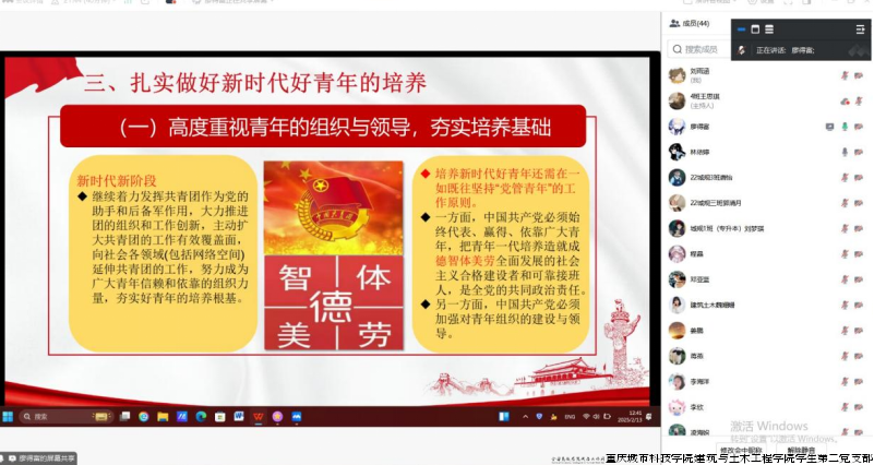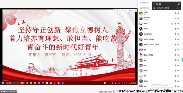 党的十八大以来,以习近平同志为核心的党中央高度重视青年工作。青年始终是社会上最富活力、最具创造性的群体,始终是推进社会进步的先锋力量。为了深刻理解当代青年所应具备的新时代新内涵。建筑与土木工程学院学生第二党支部于2025年2月13日12:25在线上开展以“坚持守正创新,聚焦立德树人,着力培养有理想、敢担当、能吃苦、肯奋斗的新时代好青年”为主题的组织生活。会议由廖得富同志主持,支部全体党员同志参加会议。