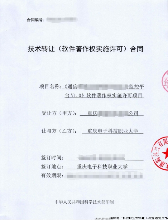 近日,重庆电子科技职业大学通工与通运党支部“双带头人”工作室党员郭渝同志代表学校与重庆XX科技有限公司签订“《通信XX网络管理安全监控平台V1.0》软件著作权实施许可项目”合同,将其自主研发的《通XX网络管理安全监控平台V1.0》软件著作权授权给企业,允许企业将该著作权用于项目开发,产品设计、生产、销售,并为企业提供包括技术相关研究内容和软件系统框架等方面的技术服务和技术指导。