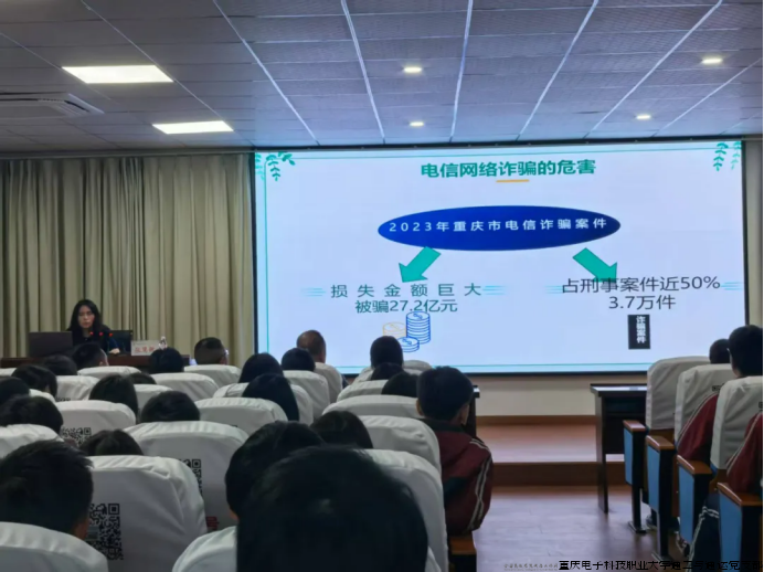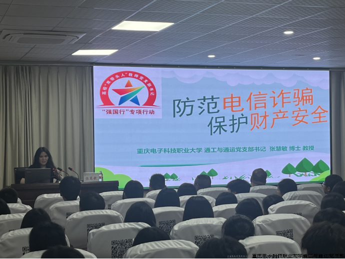 2025年5月8日,重庆电子科技职业大学通工与通运党支部书记张慧敏教授作为全国高校“双带头人”教师党支部书记“强国行”专项行动团队负责人、重庆市院士专家进校园科普活动演讲团成员,走进重庆市奉节吐祥中学校,为全校师生开展反诈骗专题讲座,通信工程学院党员流动站成员提供志愿服务。讲座主要目的是为了有效预防各类诈骗案件发生,增强师生的防诈骗意识和能力,构建平安和谐校园。