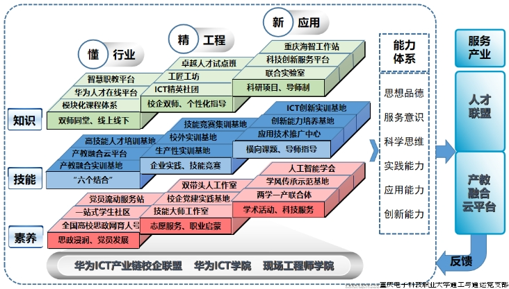 通信工程学院党总支狠抓组织建设,坚持实施“支部+专业”双建制,建设了三个以专业为基础的师生混编党支部和一个以团学为基础的学生党支部,实施了双带头全覆盖和党建双创项目建设全覆盖,形成了“支部和专业相互链接、党务和业务相互促进、育人与教书相互融合”的良好局面。学院联合与华为组成育人双主体,驱动产业链上N个企业、行业协会、科研院所共同构建“1+1+N”的华为ICT产业链校企联盟,从“知识、技能、素养”三个维度,构建“懂行业、精工程、新应用”的进阶式育人路径,培养“重品德、重意识、重思维、重实践、重应用、重创新”六方面能力,形成了“三维三阶六重”多元协同育人体系(如图1所示),“红色基站”功能日益凸显。
