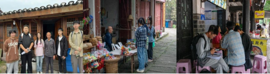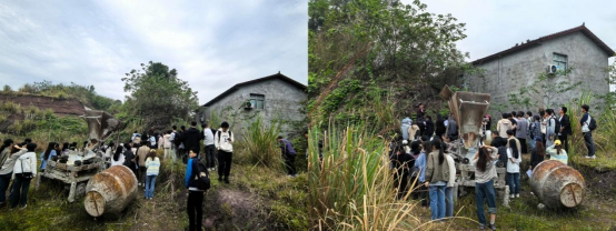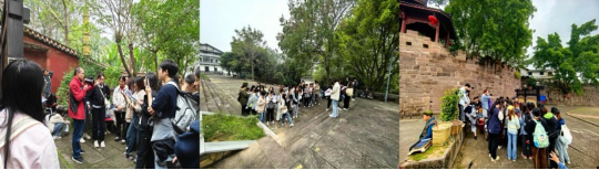10月26日早上约8点,到达第一个观测点:观音峡。在蔡进等老师的讲解下,同学们认真学习了观音峡背斜地貌的形成原因以及岩石特性和矿物组成,并以此知识点为跳板,深入学习了四川盆地的地貌构成类型和地质年代发展。约9点到达第二个观测点:废弃采矿场。老师们现场指导学生运用地质罗盘测定岩层产状、走向、倾向、倾角等要素,并对周边岩石岩层进行讲解。老师们强调了生态文明建设的重要性并让同学们思考废弃矿坑的合理利用和生态治理模式。下午1点,抵达第三个观测点:涞滩古镇。老师们带领学生参观古镇,同时介绍涞滩古镇的历史沿革、选址特征、基本性质、空间格局、传承保护、未来规划。同学们分散成各个小组对古镇居民及周边农户家庭进行入户调查。经过2个小时的深入调研,同学们了解了农户家庭的基本情况,同时咨询了村民对古镇生活的满意度以及对古镇未来发展的期望,由此深入思考当前古镇进一步发展的机遇与挑战。下午4点,抵达第四个观测点:紫色土剖面。陈帅老师讲解了农耕文明的发展与土壤的密切联系,紫色土的剖面、形成、特点。同学们因此理解了“紫色盆地”名字的由来,思考了紫色土的改良方案。