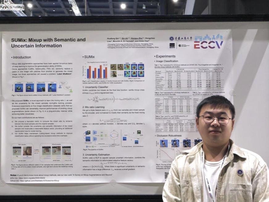 近日,我校国家智能制造服务国际科技合作基地(国合基地)负责人秦华锋教授带领的智能感知与生物特征识别团队,在计算机视觉领域取得突破。其团队和人工智能学院联合培养的2022级软件工程专业研究生金鑫、朱泓宇在第18届欧洲计算机视觉学术会议(ECCV 2024)上发表了题为“SUMix: Mixup with Semantic and Uncertain Information (ECCV 2024)”(SUMix: 包含语义信息和不确定信息的混合)的研究成果,该论文为计算机视觉数据增强领域做出了创新贡献。会议于今年9月28日至10月4日在意大利米兰举办。会议期间,该研究工作受到了来自包括北京大学,牛津大学,清华大学,莫纳什大学,中国科学技术学院,美国东北大学等单位的关注和赞赏。