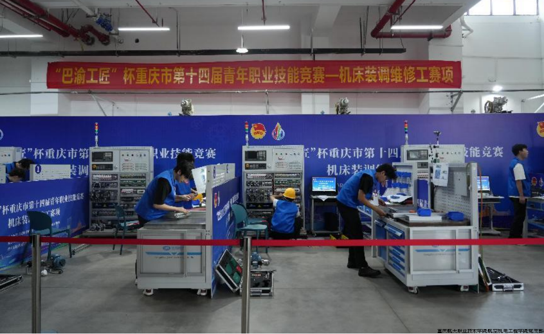 2025年6月,由共青团重庆市委、重庆市人力资源和社会保障局联合主办,重庆航天职业技术学院航空机电工程学院承办的“巴渝工匠”杯重庆市第十四届青年职业技能竞赛机床装调维修工赛项在两江校区顺利举行。本次大赛旨在进一步弘扬工匠精神,提升机床装调维修领域的技能水平,为重庆市装备制造业发展培养和选拔优秀高技能人才。