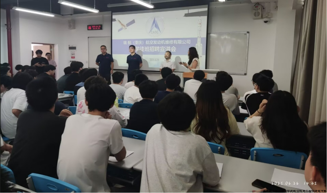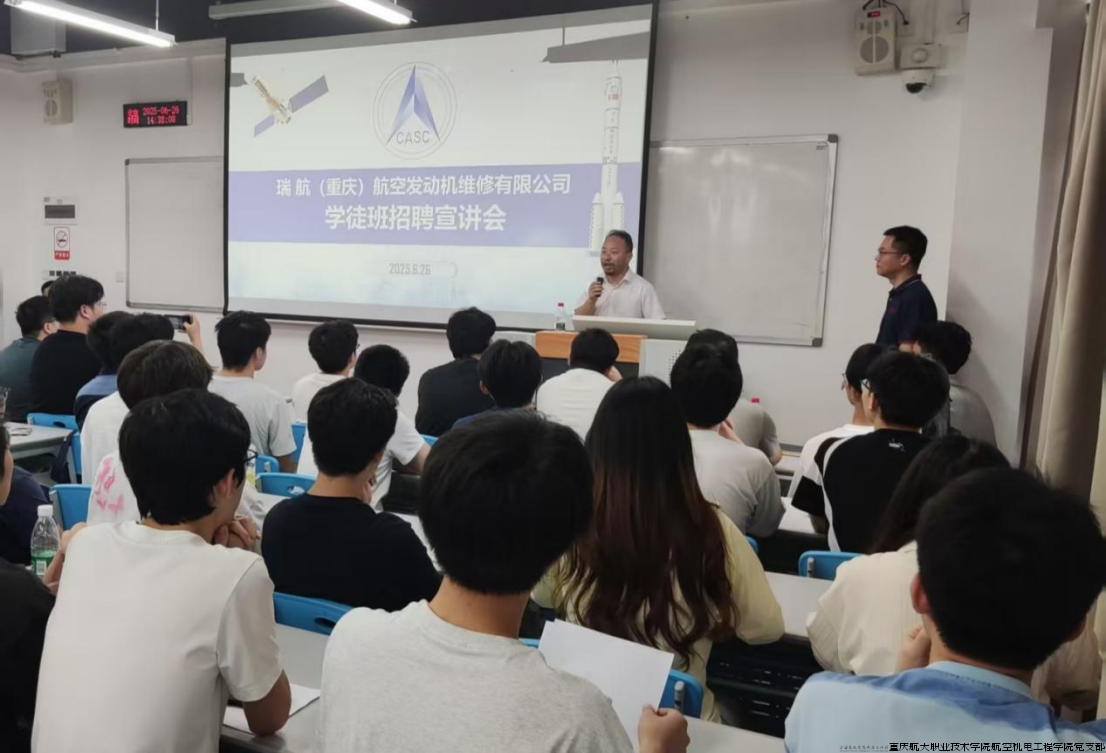 6月26日下午,瑞航(重庆)航空发动机维修有限公司首场“瑞航班”招聘宣讲会,在重庆航天职业技术学院两江校区2506教室盛大举行,现场气氛火爆。作为方大集团与重庆市人民政府战略合作框架下首个成立的航空发动机维修企业,此行也标志着瑞航公司正式启动与我校人才对接与校企合作战略,旨在校企携手共育未来航空“心脏”的卓越守护者。瑞航(重庆)航空发动机维修有限公司安全总监贾世海先生携公司生产部经理及培训部经理等3人专程来校宣讲,学校产学合作处副处长杨洋、航空学院教学主任吴道明、专业负责人罗文东老师及辅导员钟建兵老师参加。