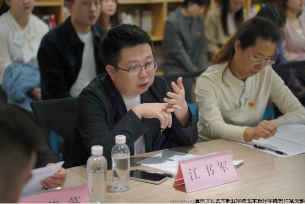 学校党委组织部(统战部)副部长康炜对我院党建工作谈3点建议:一是加强阵地建设,以服务地方发展为落脚点,打造党建平台;二是进一步清晰党建工作思路,建设特色品牌;三是落实 “一岗双责”,推动党建与业务双促进,做出艺术设计党建特色。