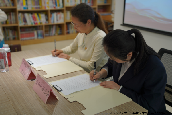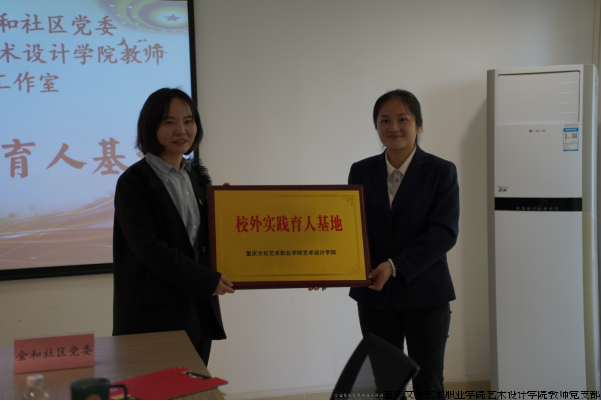 座谈交流环节,双方首先观看了学校宣传短片,让社区对学校有了更深入的了解。金和社区副书记陈春燕随后详细介绍了社区的基本情况、特色服务以及未来发展规划。双方围绕社会实践、课程思政、志愿服务、创新创业、社区美育等领域展开了深入探讨,为后续合作奠定了坚实基础。随后,双方签订了《两江新区人和街道金和社区党委、重庆文化艺术职业学院艺术设计学院党总支共驻共建协议》,并举行 “校外实践育人基地” 授牌仪式。