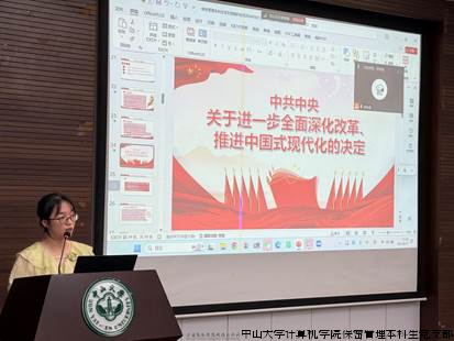 首先,支部书记罗林茵同志对党的二十届三中全会精神进行领学。她从改革开放以来党的历届三中全会要点回顾、党的二十届三中全会基本概况、学习《中共中央关于进一步全面深化改革、推进中国式现代化的决定》三个方面对党的二十届三中全会精神进行了系统阐释、深入解读。