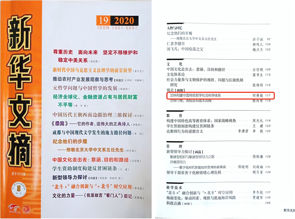 2020年第19期《新华文摘》摘登了校党委书记何秀超发表在《人民日报》2020年6月29日理论版的署名文章——《加快构建中国特色哲学社会科学体系》。
