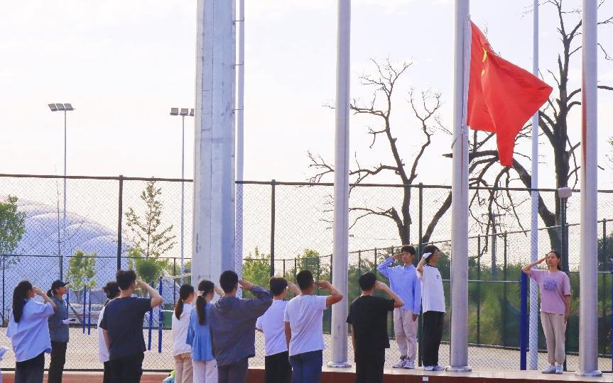 6月12日早8:00,研学团在学校丰台校区体育场举行升旗仪式。同学们看着冉冉升起的五星红旗高唱国歌,深刻体悟国家富强、民族振兴、人民幸福的真谛。