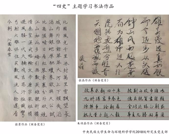 活动开展后,支部成员积极参与,以展示书法作品、用照片的形式分享家乡发生的变化等方式,展现了自己对“四史”主题学习的独特领悟,大家纷纷感叹,这些年来我们的家乡变得更加富饶,宜居,美丽,看着这些变化,也相信我们的祖国会发展的越来越好!