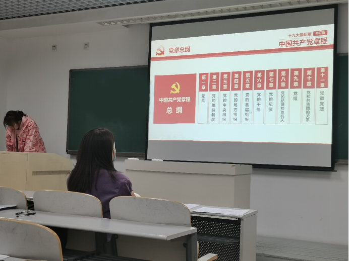 为熟悉党的基本准则和规定,了解党的法规体系基础,2021年3月25日晚八点,由生命与环境科学学院环境类本科生党支部举办的《中国共产党章程》专题学习党日活动于文华楼东区303教室举行。本次活动由高雅翾同志主讲,环境类本科生党支部副书记赵悦汝主持,党支部全体党员及预备党员共同参与。