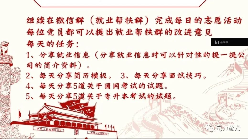 支部学生党员以毕业生为主,占学生党员总数93%。经过摸排统计,部分毕业生党员尚未找到理想的岗位。为帮助未就业毕业生党员顺利就业,2020年5月23日,郑州电力高等专科学校电力工程学院学生第一党支部开展了“开展就业帮扶,争做党员先锋”第二次主题党日