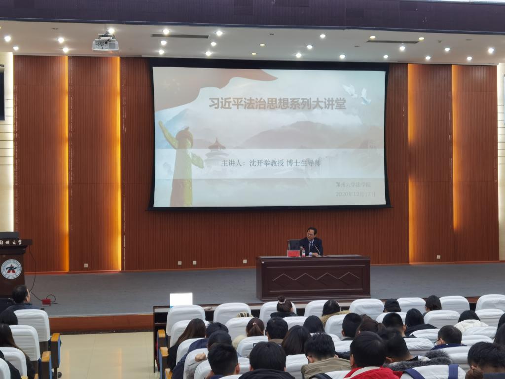 自中央全面依法治国工作会议将习近平法治思想明确为全面依法治国的指导思想以来,全国上下掀起了深入学习贯彻习近平法治思想的浪潮。2020年12月17日下午2时,习近平法治思想大讲堂系列讲座第二讲在我院模拟法庭举行,此次主讲人为我院资深教授、全国政协委员、知名学者沈开举,讲座题目为“坚定不移走中国特色社会主义法治道路——学习习近平法治思想的体会”,讲座由法学院副院长王玉辉教授主持,到场师生共计350余人。
