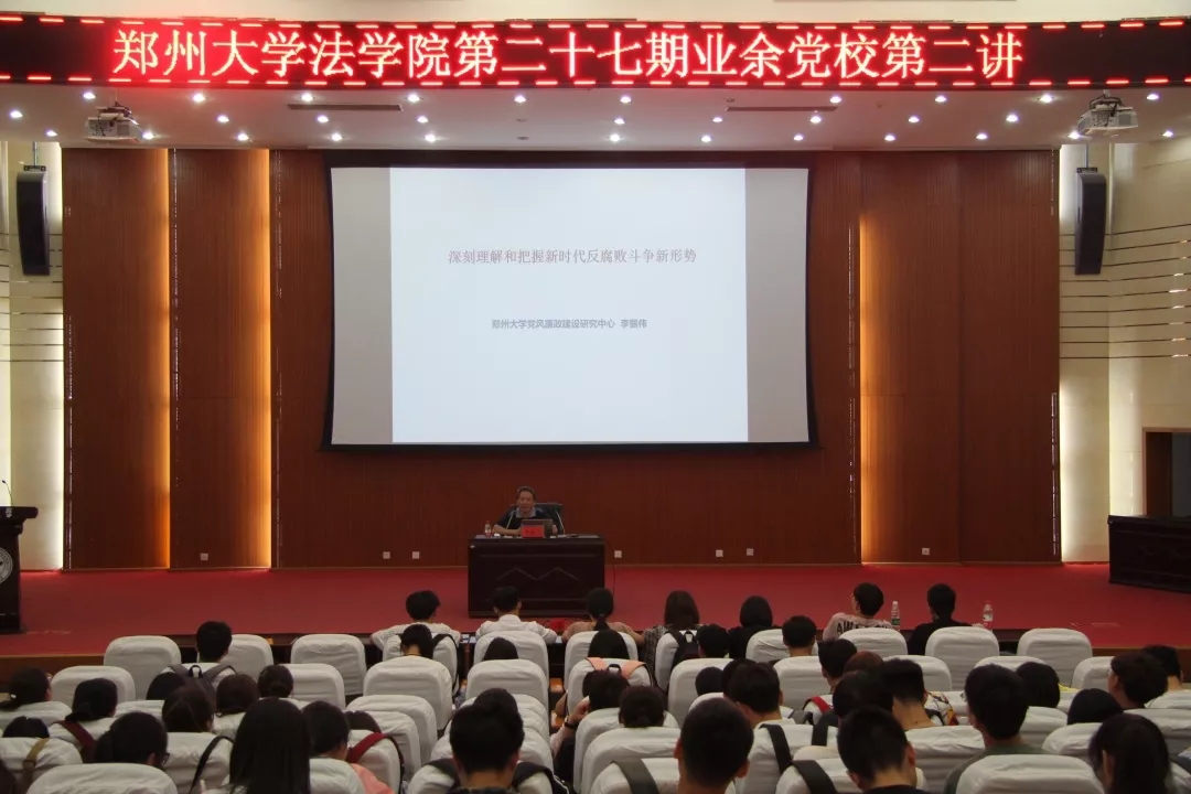 5月30日下午六点半,郑州大学法学院党课第二十七期业余党校第二讲在我院模拟法庭召开。校纪委副书记李振伟老师做了“深刻理解和把握新时代反腐败斗争新形势”的主题讲座。
