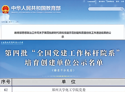 化工学院党委入选全国党建工作标杆院系培育创建单位,学院荣获2023年度河南省教育系统先进集体,化学工程与工艺系党支部入选首批河南省高校样板党支部,制药工程系党支部和行政党支部先后获批河南省高校先进基层党组织,博士生党支部入选河南省党建工作样板支部,学生团支部获评河南省五四红旗团支部;学院师生先后荣获河南省高等学校优秀共产党员、全国百名研究生党员标兵、河南省教科文卫体系统“工匠人才”、“师带徒”标兵、“优秀教师”、“出彩河南人”最美大学生、河南省百优十佳“魅力团支书”等荣誉称号。