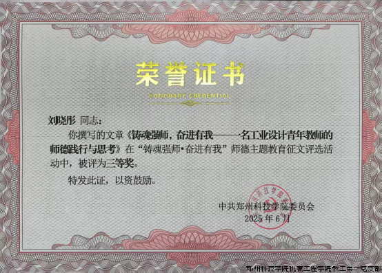 同时,支部青年党员教师刘晓彤撰写的文章《铸魂强师,奋进有我——一名工业设计青年教师的师德践行与思考》,在“铸魂强师•奋进有我”师德主题教育征文评选中荣获三等奖。文章结合自身教学实践,深刻阐述了在党建引领下青年教师对师德建设的思考与践行,体现了支部在思想政治和师德师风建设方面的扎实成效。