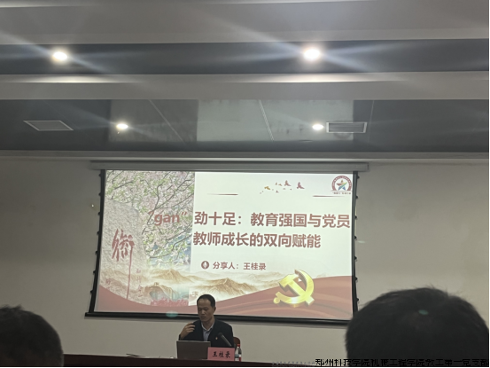 2025年9月24日下午,郑州科技学院2025年教工党支部书记及纪检委员专题培训班在众创中心四楼多功能报告厅举行专题交流活动。教育部高校“双带头人”教师党支部书记“强国行”专项行动负责人、机械工程学院教工第一党支部书记王桂录应邀作题为《“gan”劲十足:教育强国与党员教师成长的双向赋能》的交流发言,与全校教工党支部书记及纪检委员分享支部建设经验与个人成长感悟。