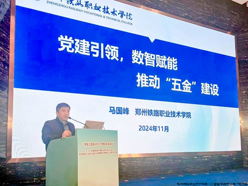 会议期间,与会代表围绕物联网技术创新、产业升级以及产教融合等前沿话题展开了热烈而深入的探讨。我院院长马国峰作了题为“党建引领,数智赋能,推动‘五金’建设”的报告分享。报告中,马院长全面介绍了我院在智慧党建、数字教材建设及产教融合开展等方面的丰硕成果,并围绕数智赋能,党建业务融合发展、推动“五金”建设、创新发展成效三个主题,深入阐述了我院在产教融合方面的探索和实践,特别是在党建引领下,如何通过数智化手段赋能教育教学,推动“五金”建设。马院长的报告深入浅出,既有理论高度,又有实践深度,引起了与会代表的广泛共鸣和热烈反响。
