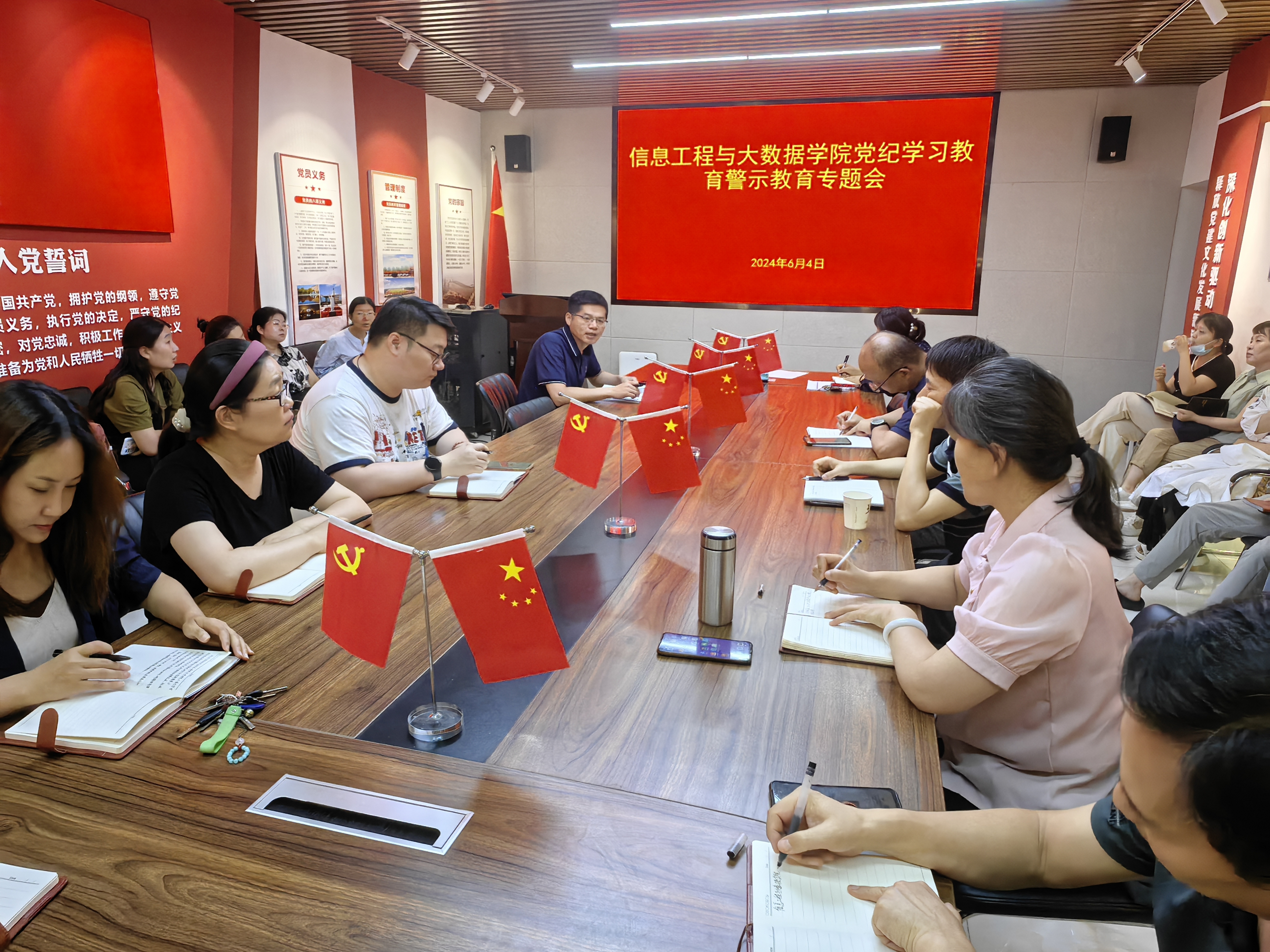 为进一步推进党纪学习教育走深走实,2024年6月4日,信息工程与大数据学院党总支在2#106会议室召开党纪学习教育警示教育专题会。会议由学院党总支书记何林智主持,全体教师参加了会议。