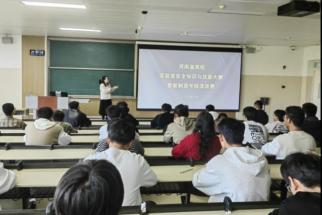 根据学校关于参加河南省高校实验室安全知识与技能大赛的活动安排,结合智能制造学院“第四届实验室安全文化宣传月”活动方案, 10月22日下午,智能制造学院在6号教学楼301教室组织开展了河南省高校实验室安全知识与技能大赛选拔赛,共有41名学生参赛。